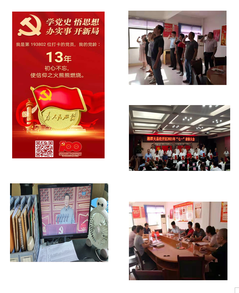 慶祝中國共產(chǎn)黨成立100周年大會于7月1日上午8時在北京天安門廣場隆重舉行。湘潭市冶金設備公司黨支部組織全體黨員干部、入黨積極分子齊聚觀看慶祝大會直播。大會前,全體人員肅立向黨旗鄭重宣誓,奮發(fā)有為,不忘初心。在建黨百年之際,我們將按照“一個引領(lǐng),兩個堅定”的工作思路要求,知重負重、攻堅克難,努力為公司的發(fā)展再創(chuàng)佳績。